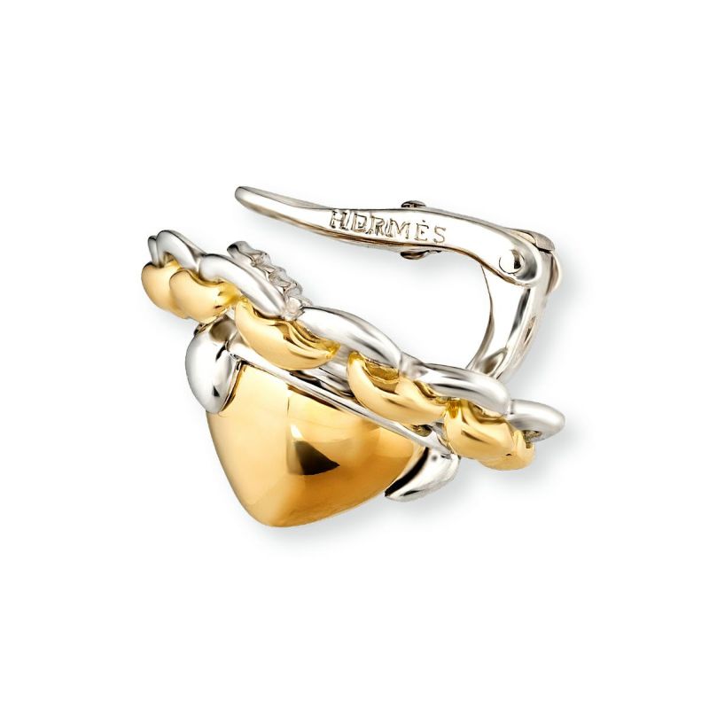◇制作年代:1980年代 シュガーロフの形状のゴールドを宝石に見立て、エルメスらしいチェーンモチーフのフレームで装飾した非常に希少なヴィンテージ作品。 ヴィンテージエルメスのなかでも18金を用いて仕立てられたファインジュエリーは近年欧米市場を中心に価格が急騰しており、資産性の高いコレクターズアイテムとしても注目されている。