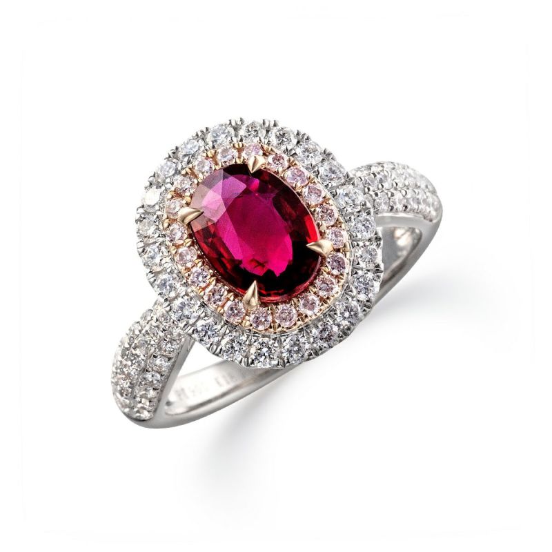 メインストーン:ルビー (1.40ct オーバルシェイプ) サイドストーン:ダイヤモンド(0.81ct)*内周取り巻き部分のピンクダイヤモンド0.14ct, その他のカラーレスダイヤモンド0.67ct)