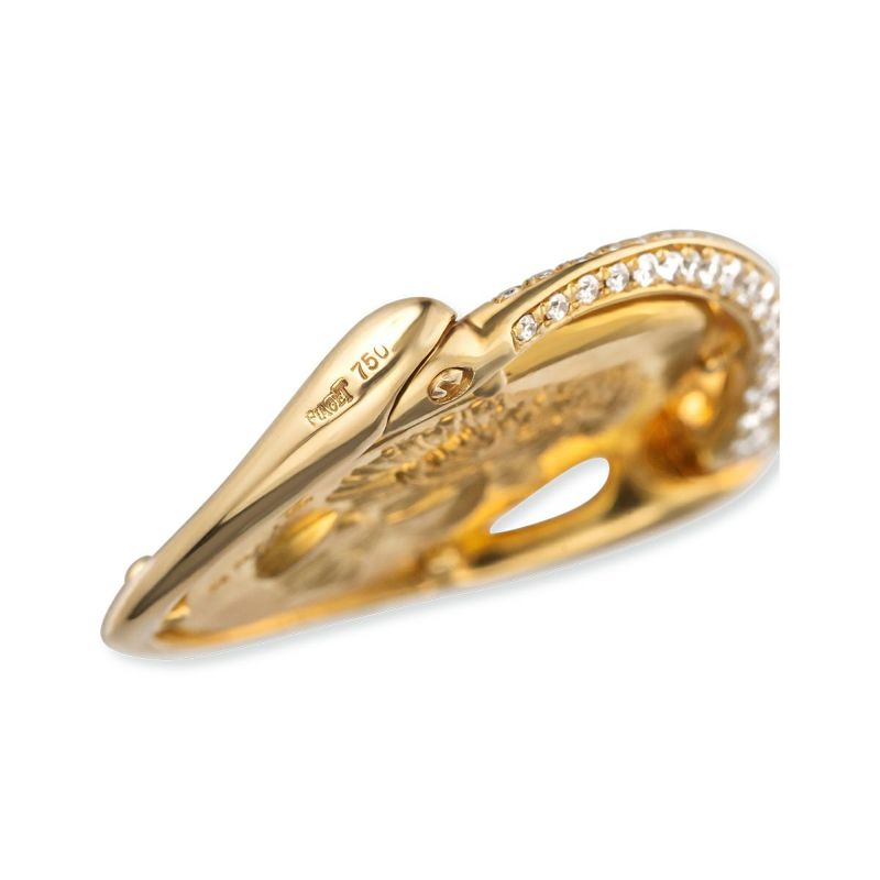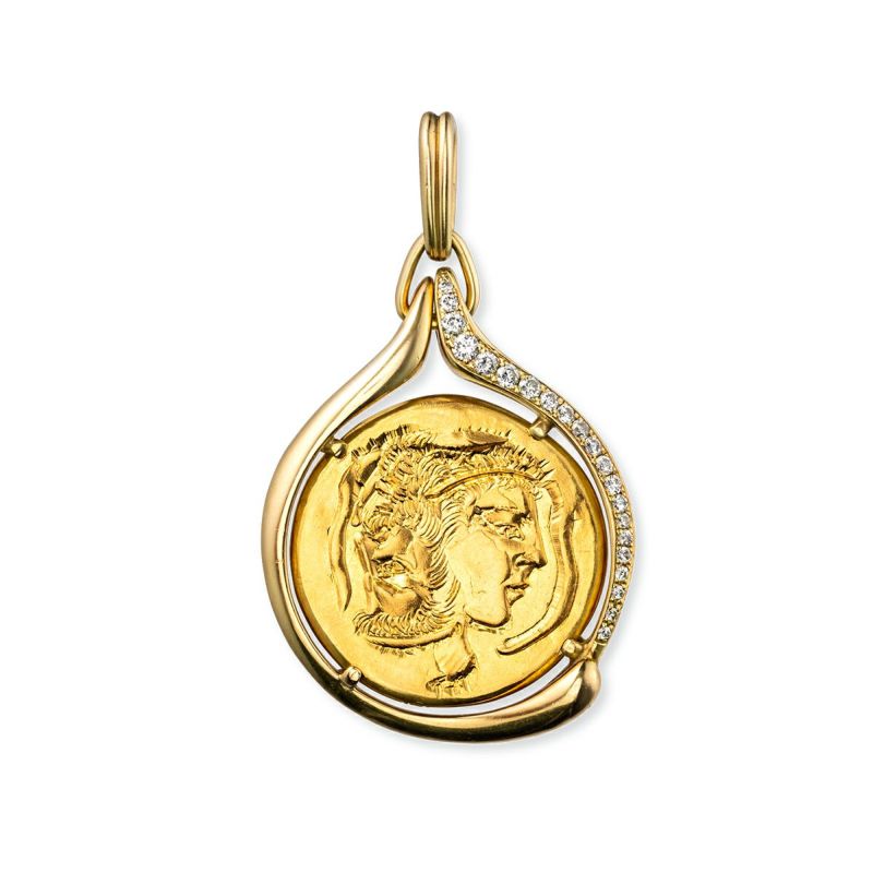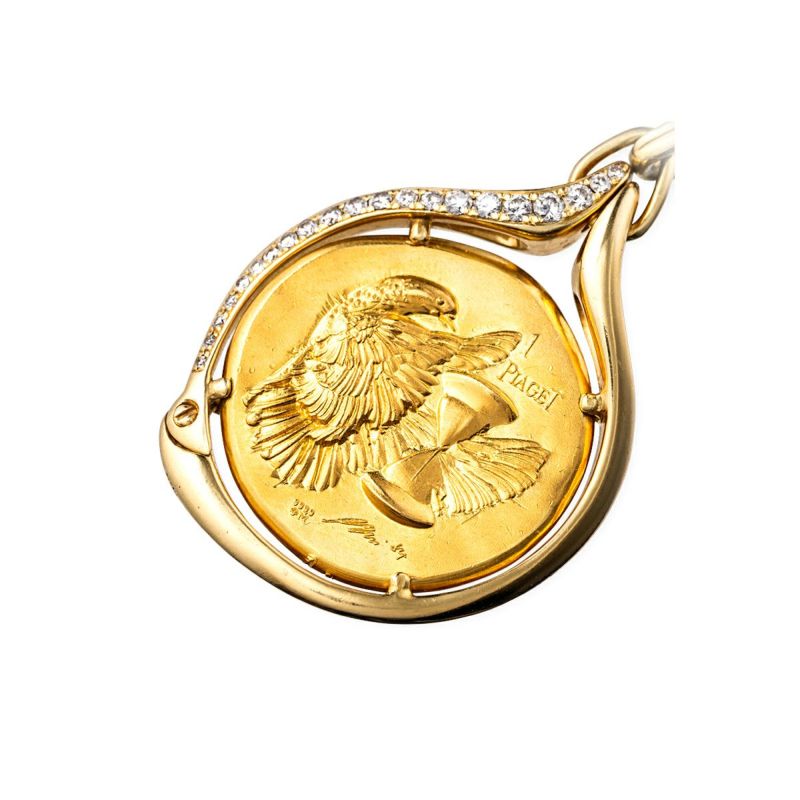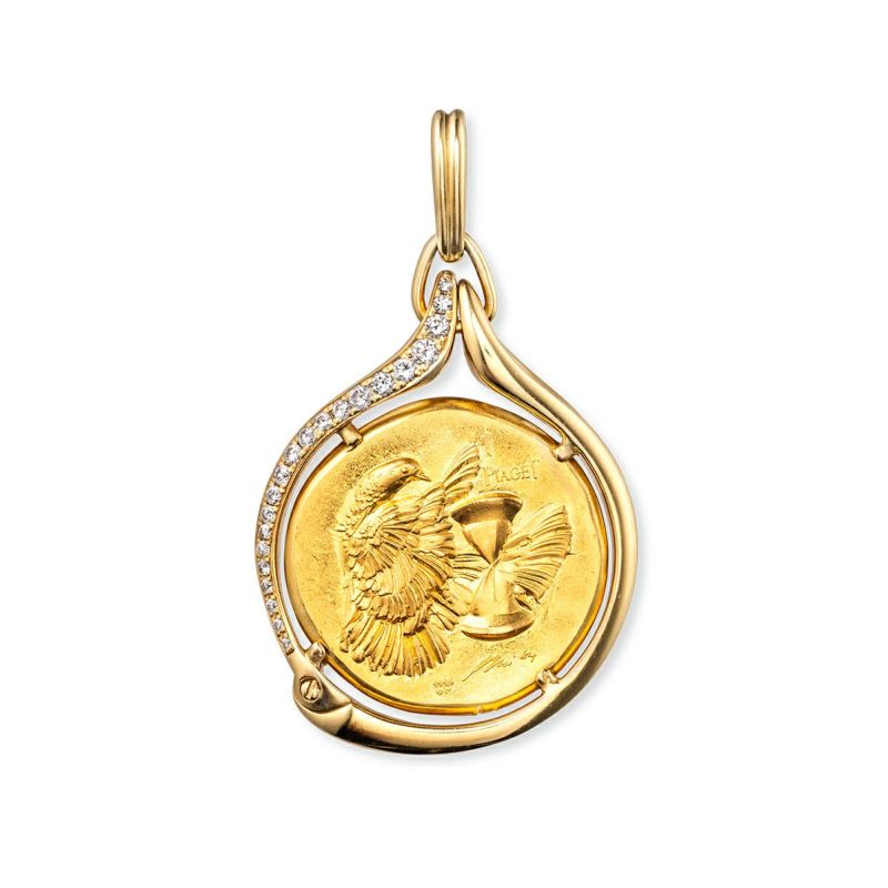 ※リバーシブルで着用可能。 〈作品説明〉 1984年頃にピアジェがスイスのアーティスト ハンス エルニ(1909-2015)とのコラボレーションによって制作したネックレス。シュールレアリズムをはじめとする実験的な絵画で知られるハンス エルニは切手やコインなどのためのミニチュアアートの制作でも知られている。純金(24金)のコインの片面に鳩と砂時計、もう片面には2つの横顔を組み合わせたシュールレアリズム的な意匠があしらわれ、ハンス エルニの芸術性とピアジェの宝飾技術の粋がいかんなく発揮されたすぐれたアート作品。