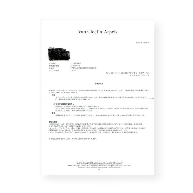 シリアルナンバー:JA391717 ※2018年にヴァンクリーフが発行したブランド証明書と、2025年に同じくヴァンクリーフが発行した修理証明書付(修理箇所:クラスプ接続輪管の変形直し)