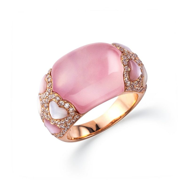 メインストーン:ローズクォーツダブレット(12.52ct) ☆ サイドストーン:ダイヤモンド(1.00ct)/マザーオブパール ☆メインストーンはローズクォーツの下にマザーオブパールを貼り合わせたダブレットストーン