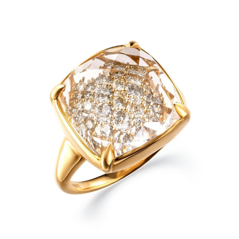 メインストーン:ロッククリスタル サイドストーン:ダイヤモンド(0.50ct) ※パヴェセッティングされたダイヤモンドの上にチェッカーボードカットのロッククリスタルを被せた構造