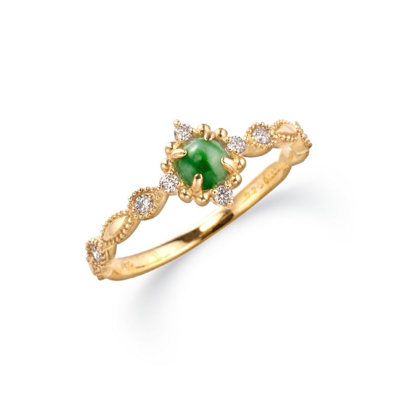 メインストーン:ヒスイ(0.28ct カボションカット) サイドストーン:ダイヤモンド(0.11ct)