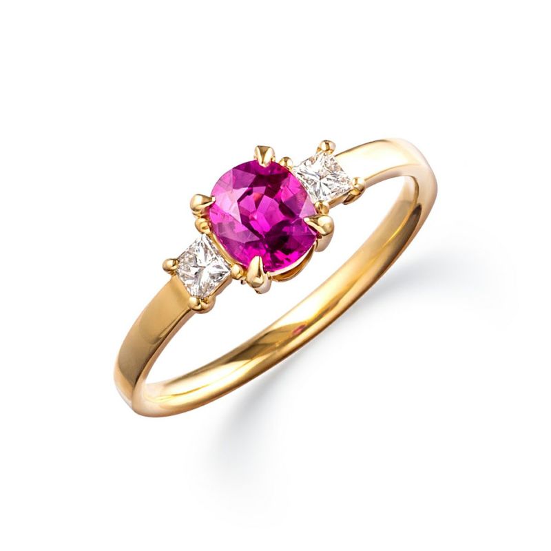 メインストーン:ビルマ産ピンクサファイア(0.806ct オーバルシェイプ) サイドストーン:ダイヤモンド(0.20ct プリンセスカット)